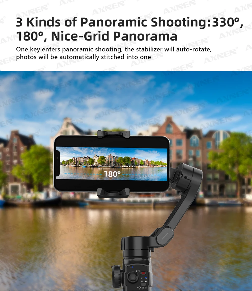 One key enters panoramic shooting, the stabilizer will auto-rotate, photos will be automatically stitched into one.