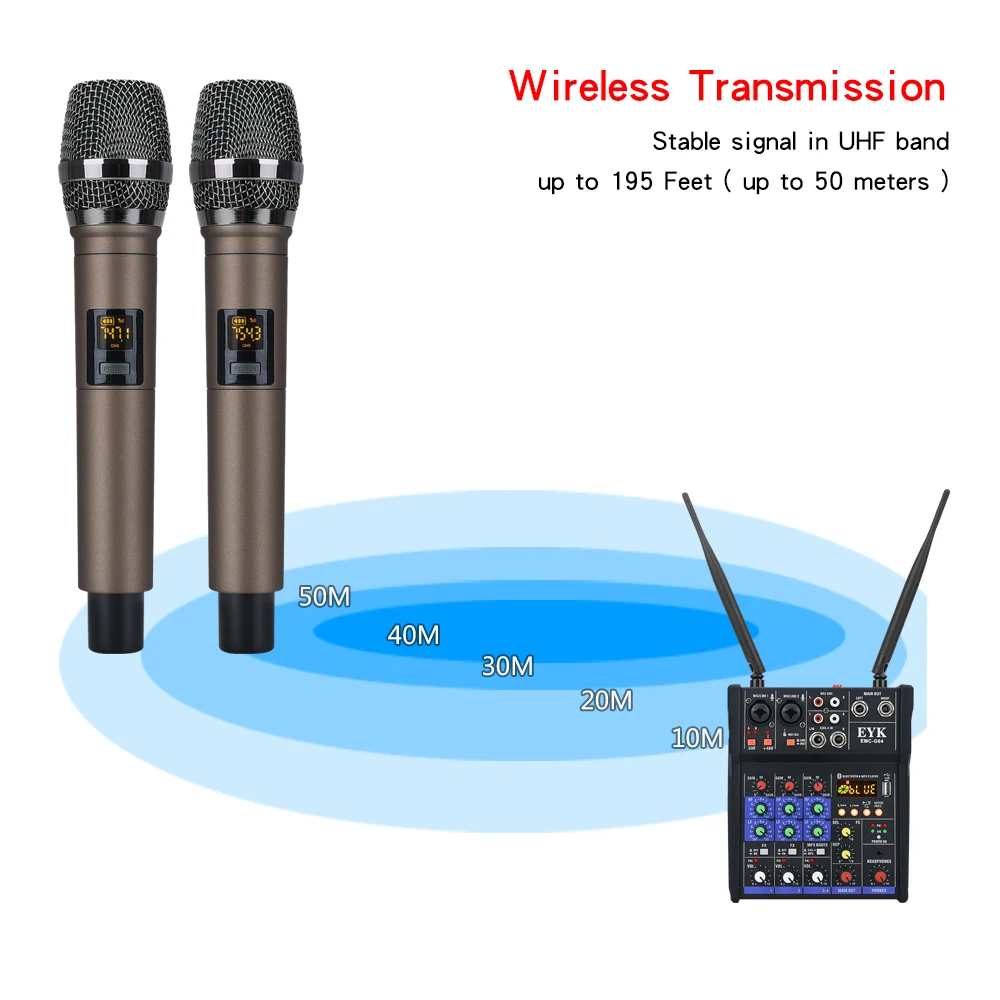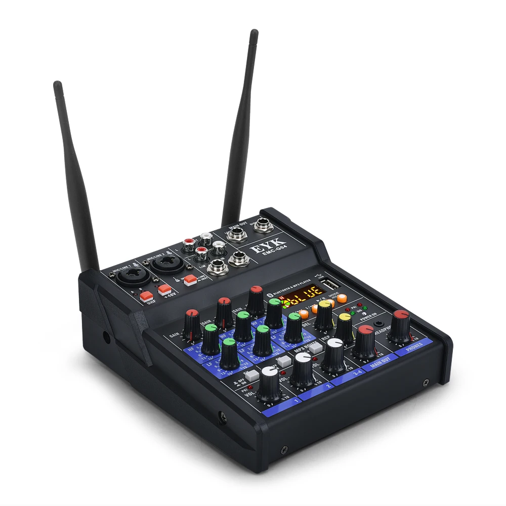 EYK Stereo Audio Mixer Build-in UHF Wireless Mics 4 Channels Mixing Console with Bluetooth USB Effect for DJ Karaoke PC Guitar