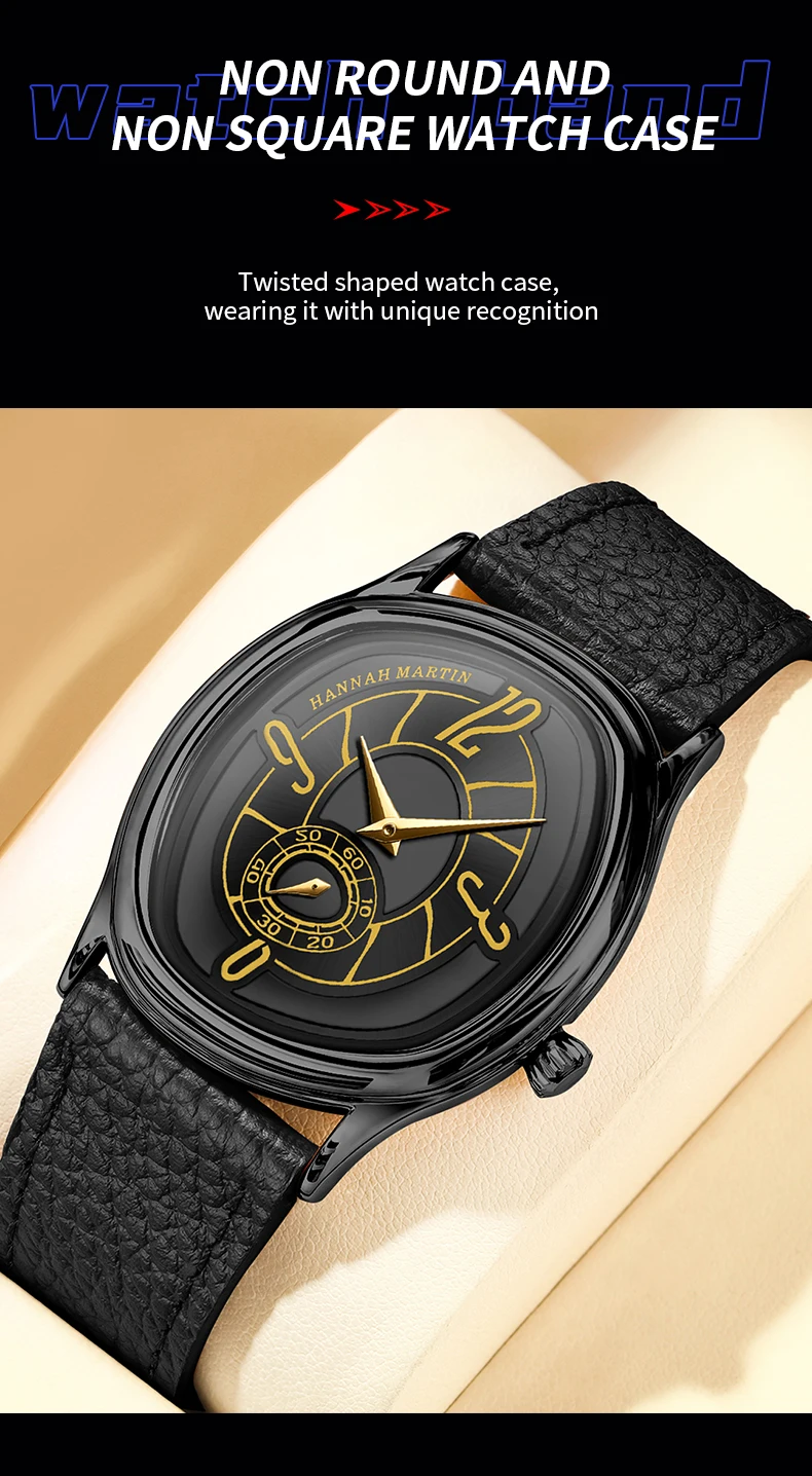 HANNAH MARTIN Man Watch Creative Gold Leather Clock 40mm Dreamy Geometric Case Women 3Bar Waterproof Couple Dress Watch for Men