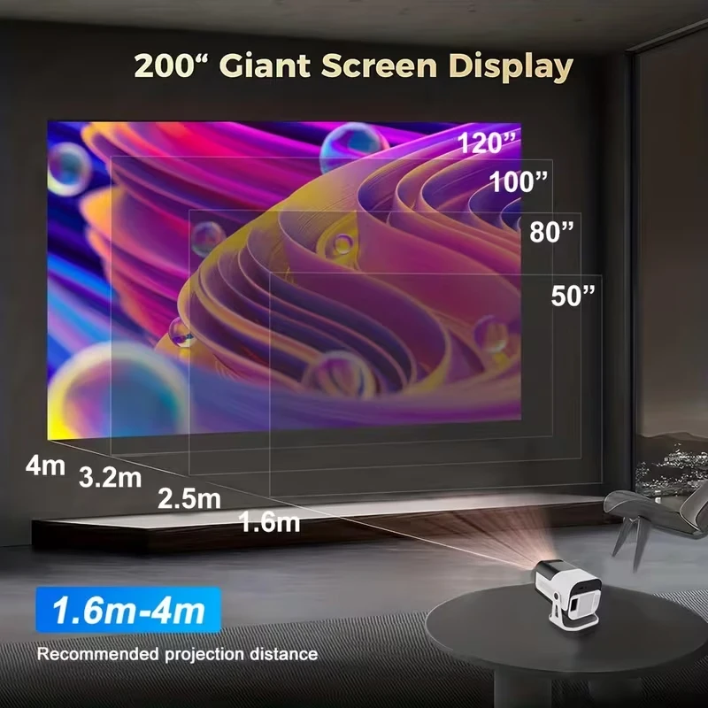 The portable projector provides a 30-300-inch projection display at a projection distance of 1-4 m, with a 16:9 aspect ratio, optimal viewing in both home theaters and outdoor movies!
