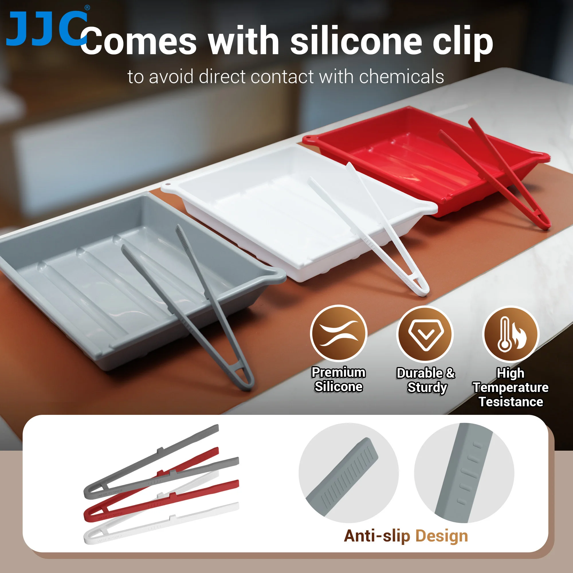 JC DT-1012 Series Developing Tray comes with a silicone tong, which allows users to handle photographic paper or film without direct contact with chemicals and enhances safety during operation. The bottom is equipped with four silicone pads to improve stability and prevent slipping or tipping in the process of use.