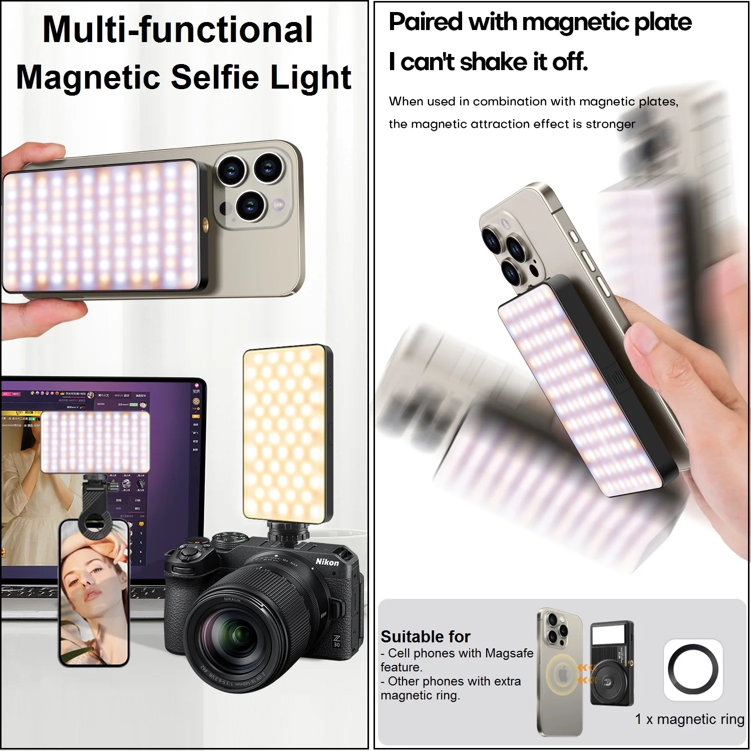 【Magnetic LED Fill Light】Say goodbye to cumbersome selfie light clips! Our M19 magnetic phone light compatible with MagSafeelevates your mobile photography with seamless magnetic alignment for iPhone 16/15/14/13/12 series. Easily attach and detach with the magnet, saving you time and hassle while enhancing your overall user experience. (For non-magnetic devices, we’ve included an adhesive metal ring; If your phone or phone case does not have magnetic, we also provide you with a magnetic ring.)