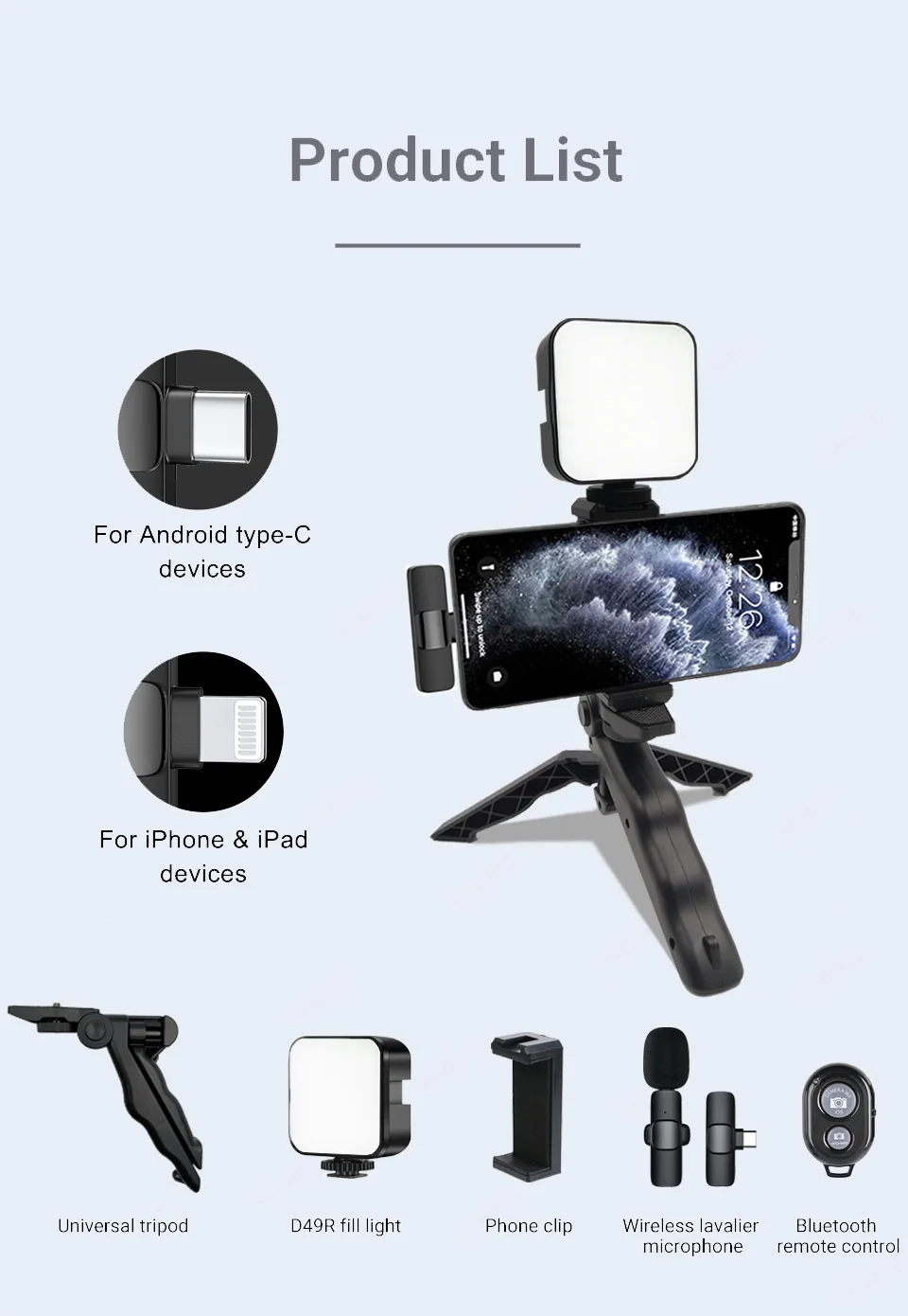 Wireless Lavalier microphone *1, led fill light *1, universal tripod *1, mobile phone bracket *1, Bluetooth remote control *1